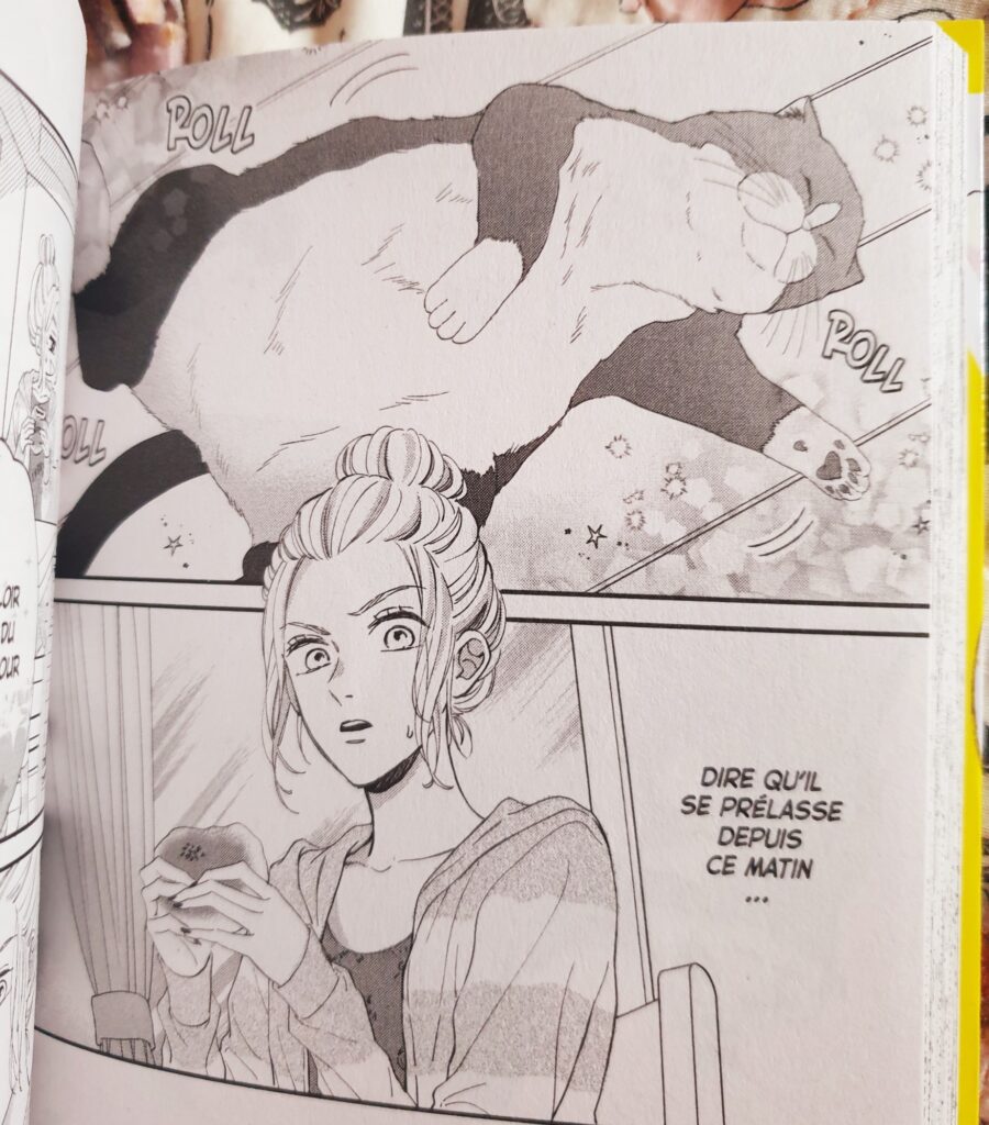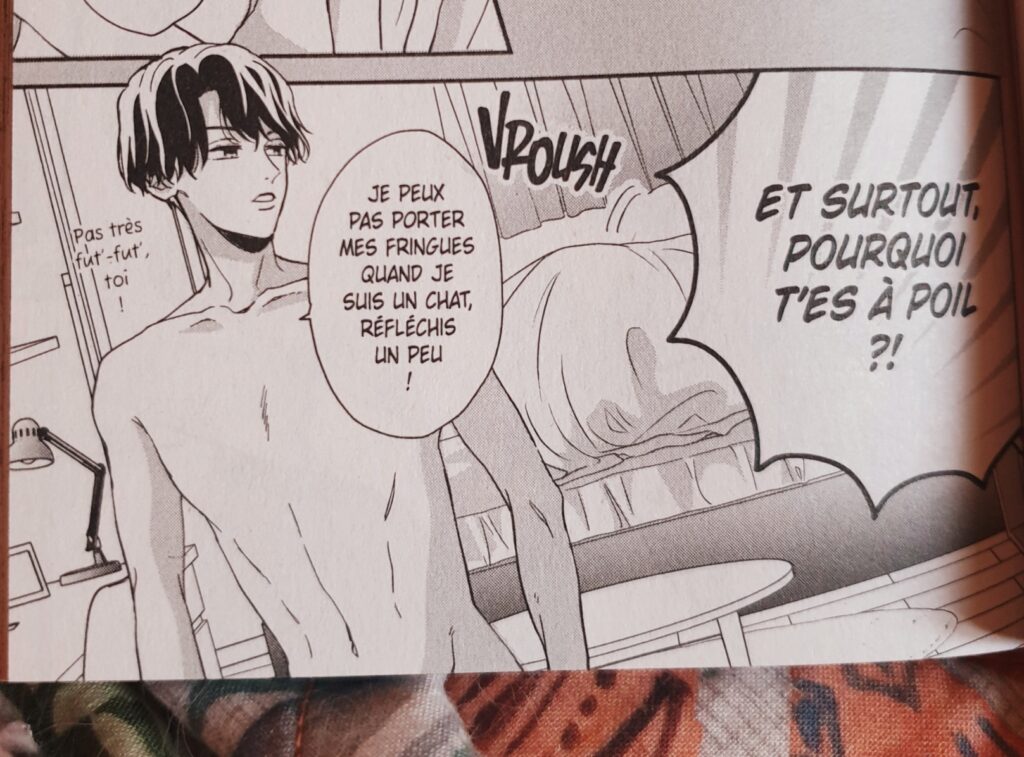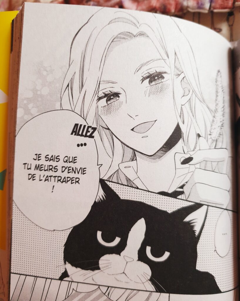 D’une certaine manière, Senri lance un bâton de dynamite dans la chambre d’Erina sous la forme d’un beau catboy, allume la mèche en le mettant à poil constamment, puis éteint la mèche en le castrant symboliquement et en lui donnant un air de grumpy cat. Pour mieux faire passer la pilule et nous caresser dans le sens du poil, elle nous propose aussi un très beau dessin à la fois des visages humains (on adore les expressions outrées d’Erina) et de ce gros chaton fluffy.
